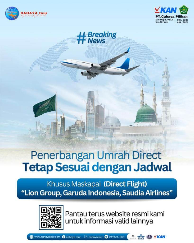 Tim Cahaya terus berkoordinasi dengan pihak maskapai dan otoritas bandara untuk memastikan penerbangan umrah langsung (Direct Flight) Insya Allah berjalan sesuai denga jadwal 😊